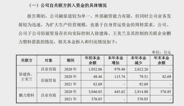 2020 年,昌亞有限(昌亞股份的前身)向實際控制人徐建海、王美蘭累計借入 979.4萬元,用於公司生產經營;同年,昌亞股份子公司佰麗貿易向實控人累計借入113.74萬元。