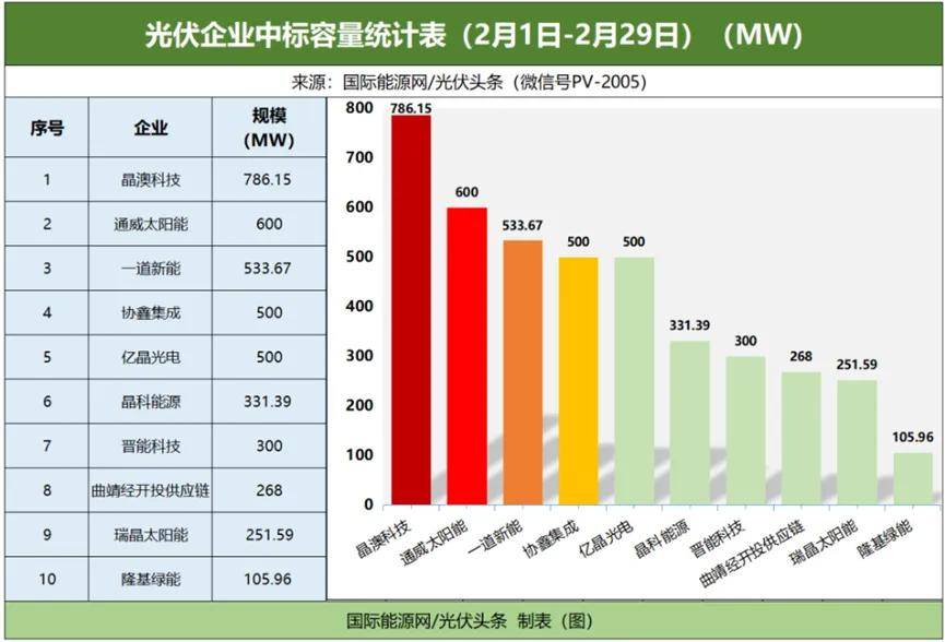 這一最低價,由晶澳科技投出。正因如此,晶澳在2月的中標項目表現突出,中標容量達到786.15MW,位居統計週期第一。