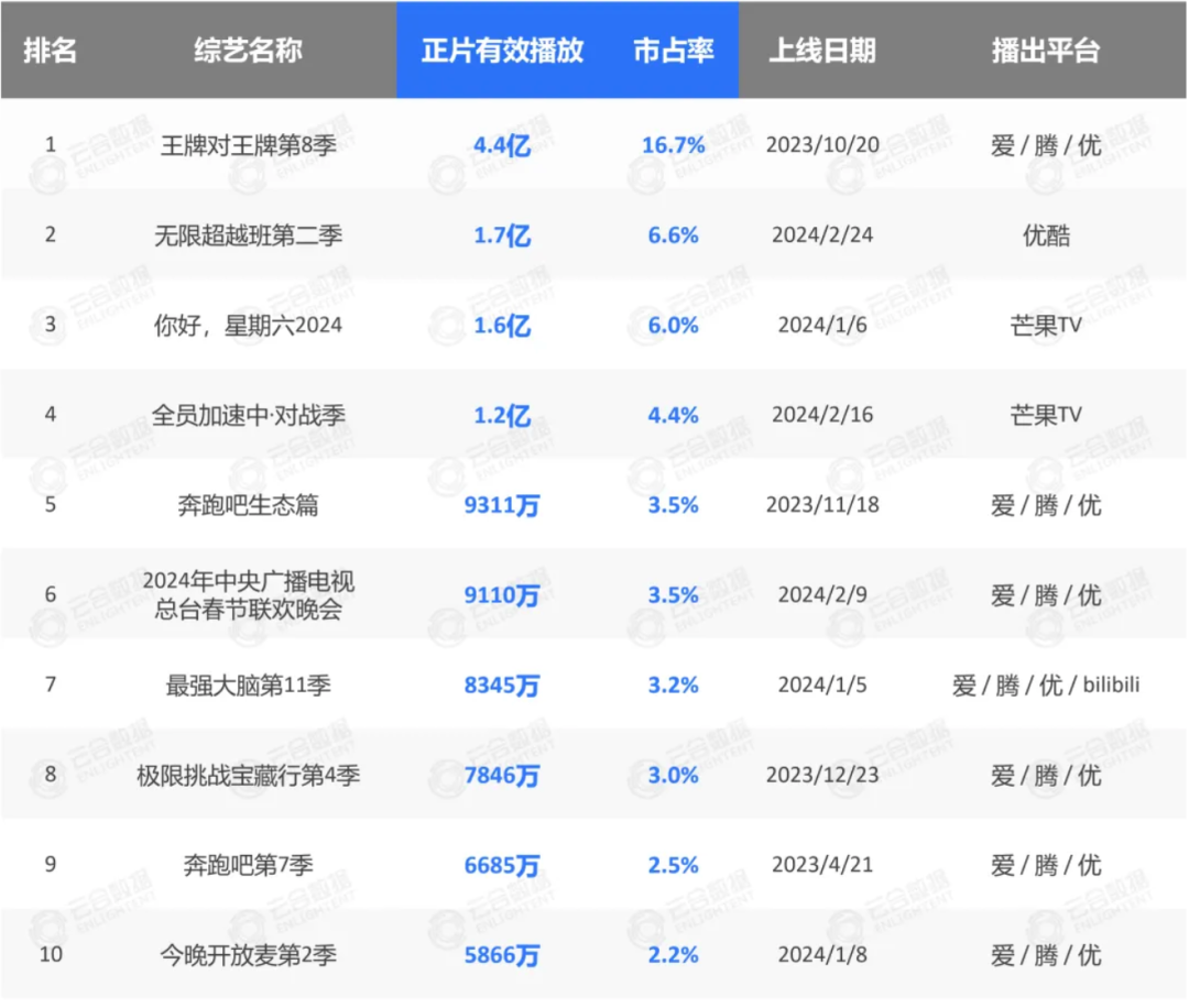 根據雲合數據統計,2024年Q1電視綜藝正片有效播放和市佔率前十的綜藝有9檔為綜N代,唯一的例外則是2024總枱春晚。其中,《王牌對王牌第8季》以4.4億有效播放和16.7%的市佔率穩居榜首。前二十名中只有《炙愛之戰》《無限超越班》兩檔新綜藝,分別以3838萬、2116萬有效播放和1.5%、0.8%的市佔率位列12和19名。