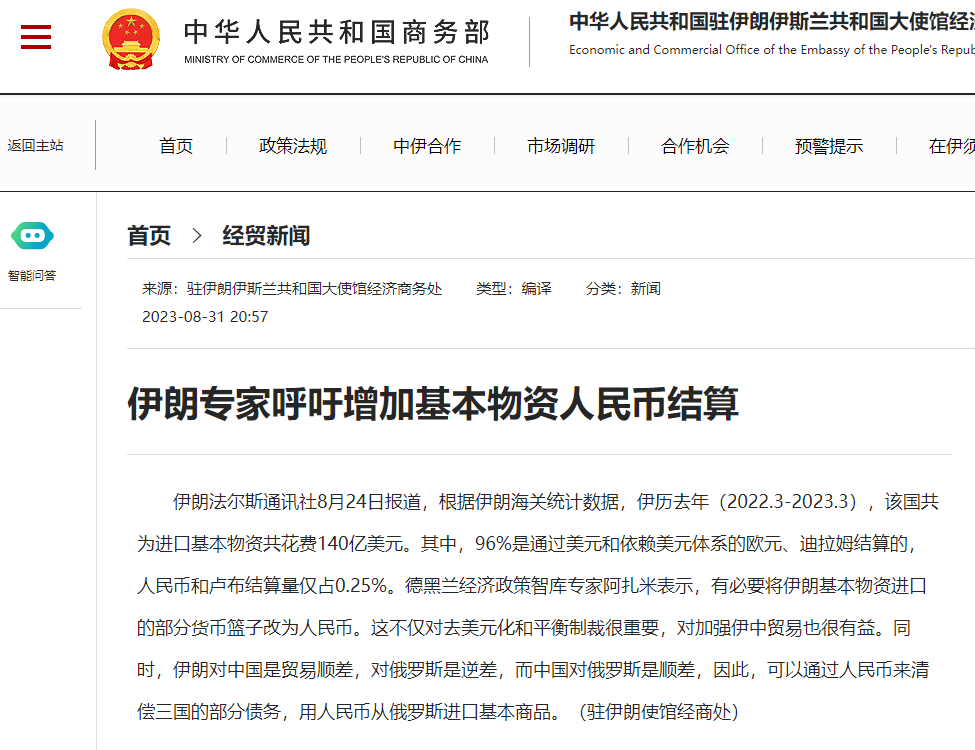 而且,大家看看2023年的新聞:伊朗專家呼籲增加基本物資人民幣結算。