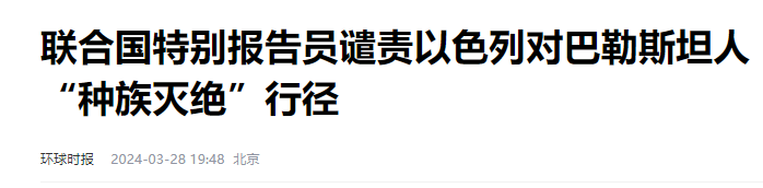 3月27日,聯合國巴勒斯坦被佔領土人權狀況特別報告員弗蘭切絲卡·阿爾巴內塞説,以色列對巴勒斯坦人的“種族滅絕”行徑超越了“戰爭罪”和“危害人類罪”的範疇。