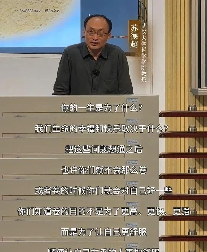文娛價值官打開蘇德超的視頻,無意中一個小時就過去了,他精闢的闡述讓人有茅塞頓開的感受。比如,蘇德超講內耗,首先要解除因內耗產生的自責心理,內耗可能是因為追求完美,往往內心細膩豐富,其次是去行動,挑戰自己。蘇教授的“靈魂拷問”充滿思辨又富有温度。