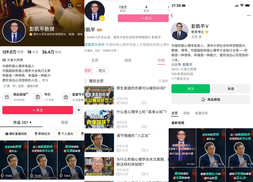 文娛價值官觀察,彭凱平是善於藉助視頻平台傳播知識的學者,在抖音、B站、視頻號等平台上,都開設他的認證賬號,並上傳了大量知識分享的短視頻。在直播回放裏,文娛價值官看到彭教授對現場網友提出的一些問題進行了反饋和互動。而在短視頻尚未興起的彼時,一位清華大學心理學院的院長與完全不認識的路人進行交流,簡直難以想象。**流媒體讓學者與求學者之間的距離縮短到零,難怪有網友説,未來社會的孩子們,將處於知識過剩的環境**裏。