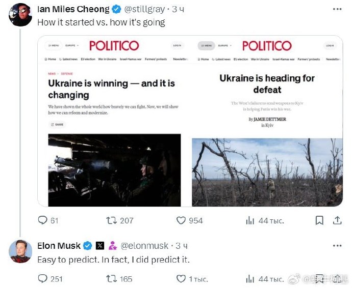 馬斯克推特評論politico預測烏克蘭從獲勝變成失敗一事:”烏克蘭的失敗很容易預測嘛,我早就預測了“