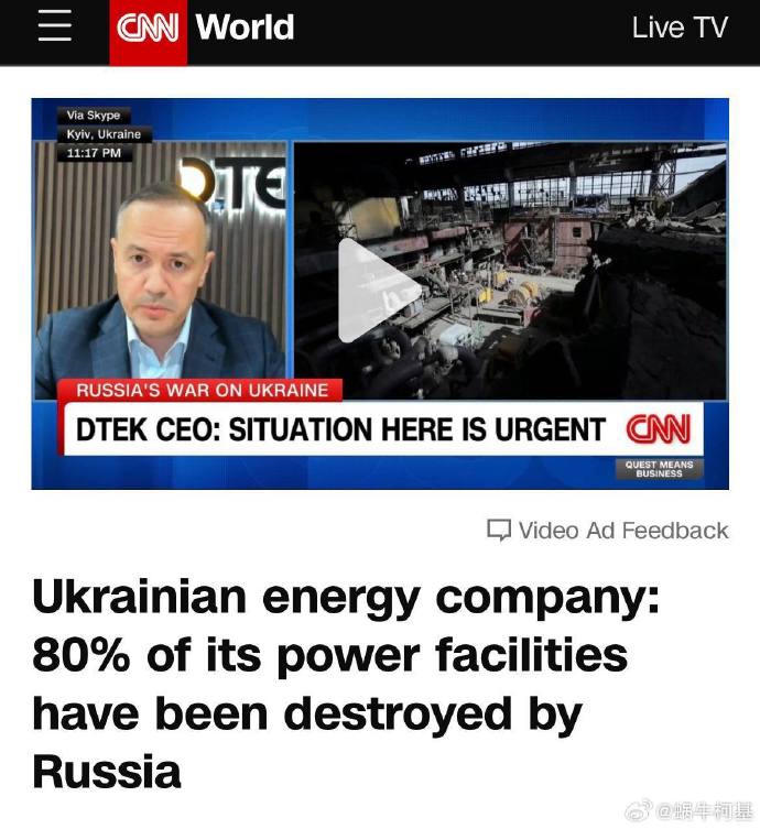 烏克蘭能源行業最大的私人投資者DTEK的CEO稱俄羅斯摧毀了烏克蘭80%的能源設施。