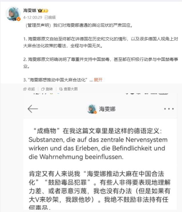 但是呢,很多大V認為這是海雯娜試圖推進大麻在中國合法化,是一種“文化演變”,其心可誅。