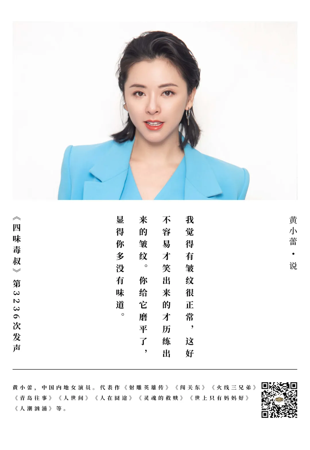 **黃小蕾:**不能P得失真了,我覺得有皺紋很正常,這好不容易才笑出來的才歷練出來的皺紋。你給它磨平了,顯得你多沒有味道。