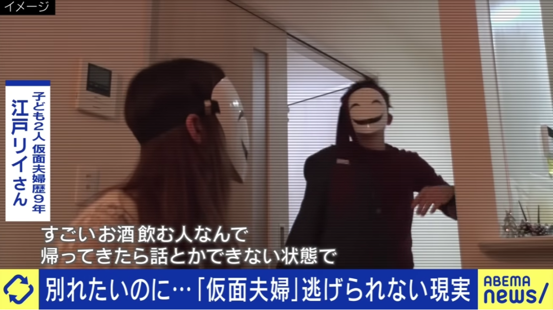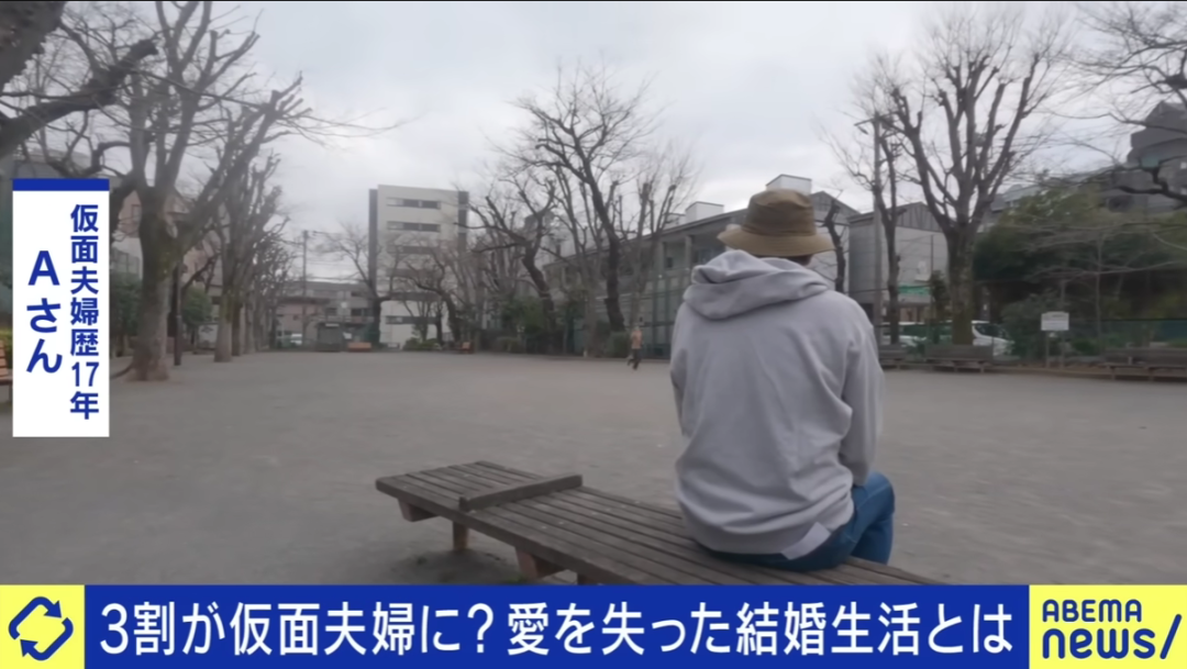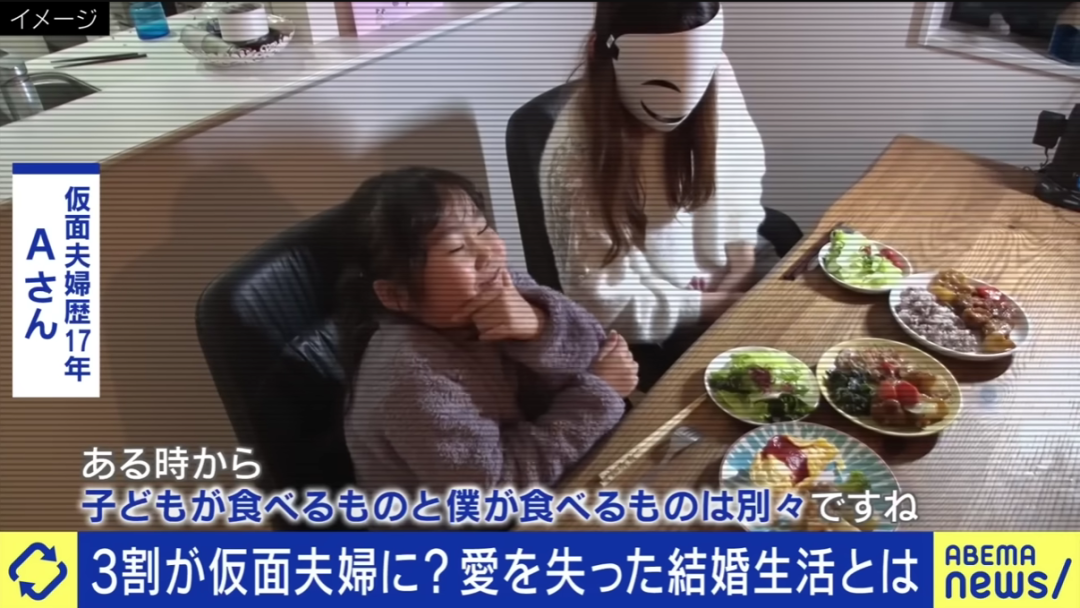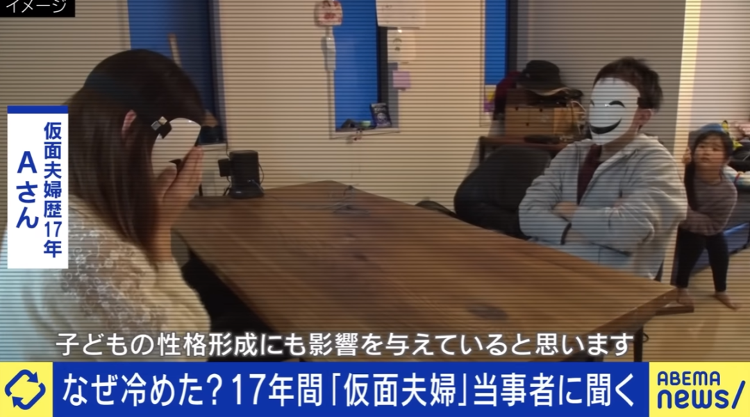結婚超過了20年以上的A桑在面對鏡頭時説,他們家中假面夫妻的生活已經持續了17年。