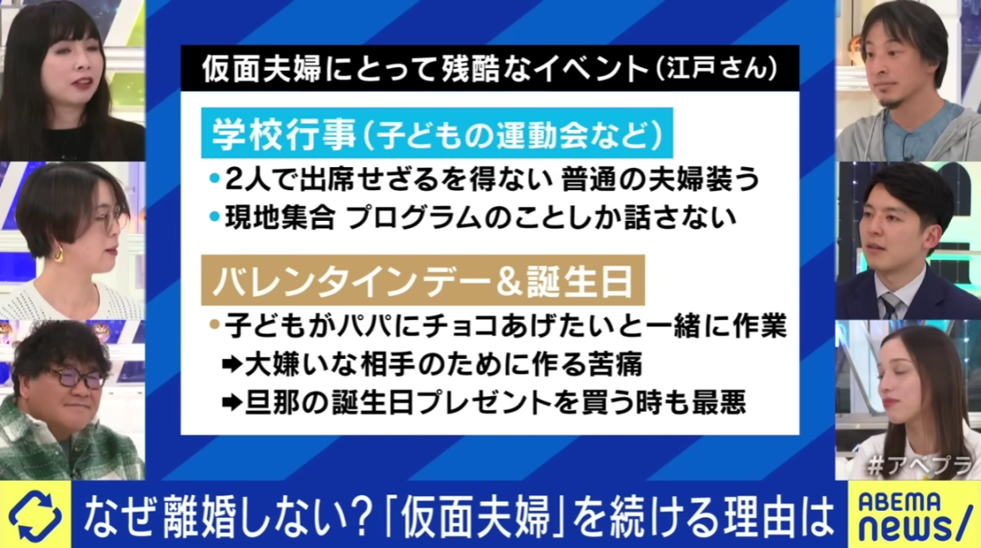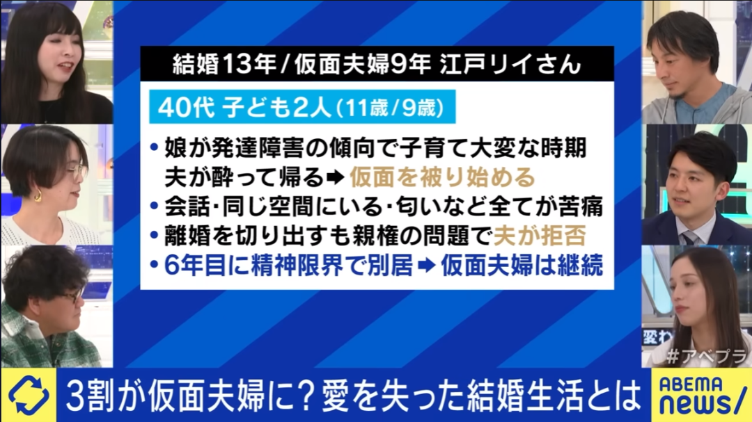 不過同一屋檐底下的假面夫妻生活江户桑和丈夫也沒有持續太久,在第6年時,倆人選擇了分居。至今依然是分居不離婚的假面夫妻中。