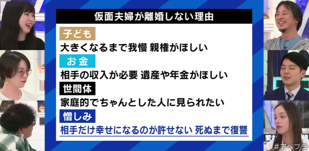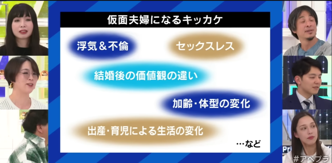 專家也説出瞭如今日本很多夫妻變成假面夫妻的一些緣由和契機。有的是因為婚內出軌、無性婚姻、婚後價值觀不同、年齡和體型的變化、生娃和育兒等生活的變化等等都會造成假面夫妻。