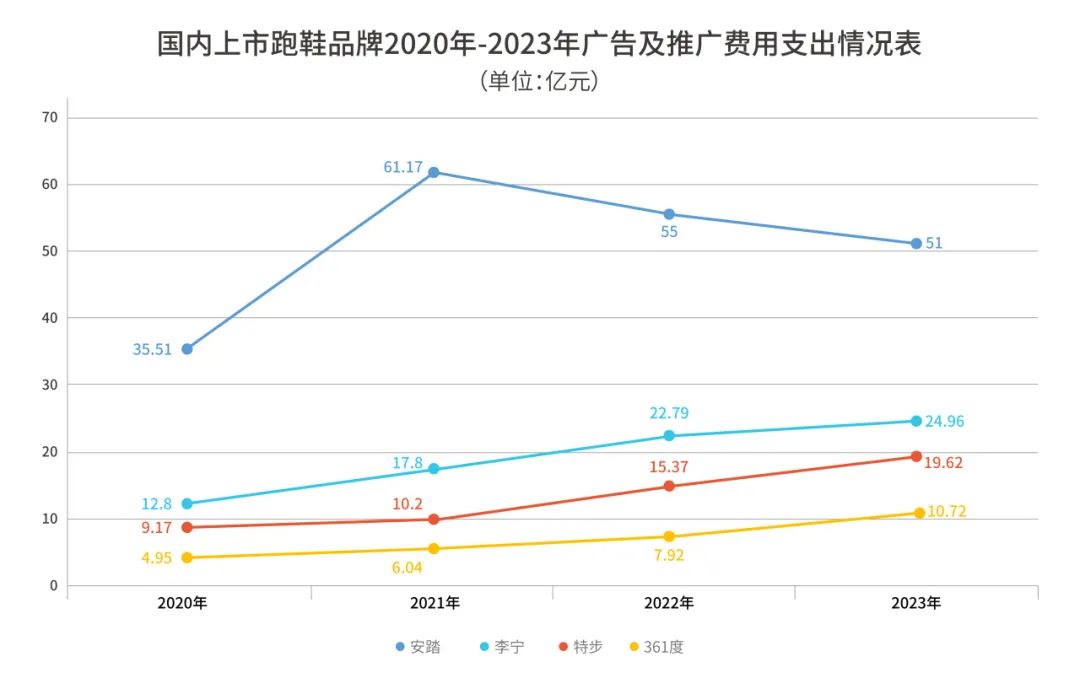 源媒匯統計了國內上市跑鞋品牌2020-2023年的廣告及推廣費用支出,頭部品牌安踏、李寧在營銷費用的支出上正逐步放緩,並將重心放到自身的品牌佈局當中;而渴望在馬拉松賽事市場上有所突圍的361度,在品牌營銷推廣費用的投入上則是緊隨特步。