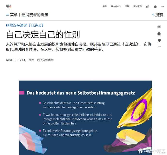 1、德國身份證件上的男性、女性不再需要與生物特徵有關,只需要自我感知,就可以在法律上得到承認。