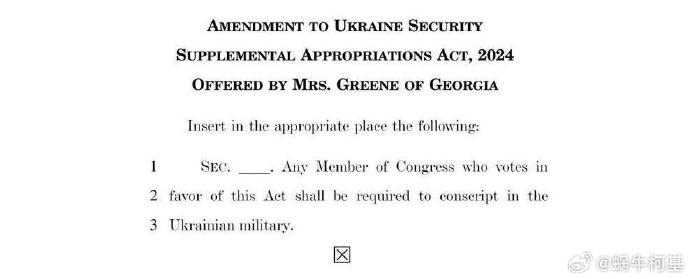 在眾議院議長約翰遜表示將對《烏克蘭安全補充撥款法案》進行表決時,共和黨議員格林對提出了三項修正,其中包括,
