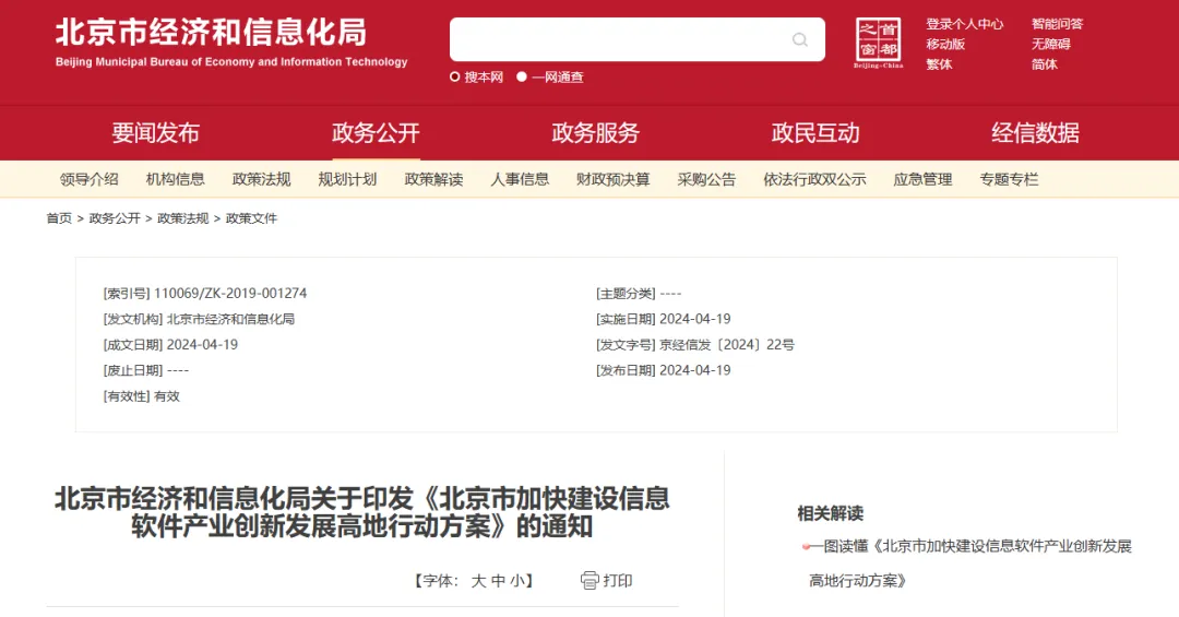 4月19日,北京市經濟和信息化局印發《北京市加快建設信息軟件產業創新發展高地行動方案》。