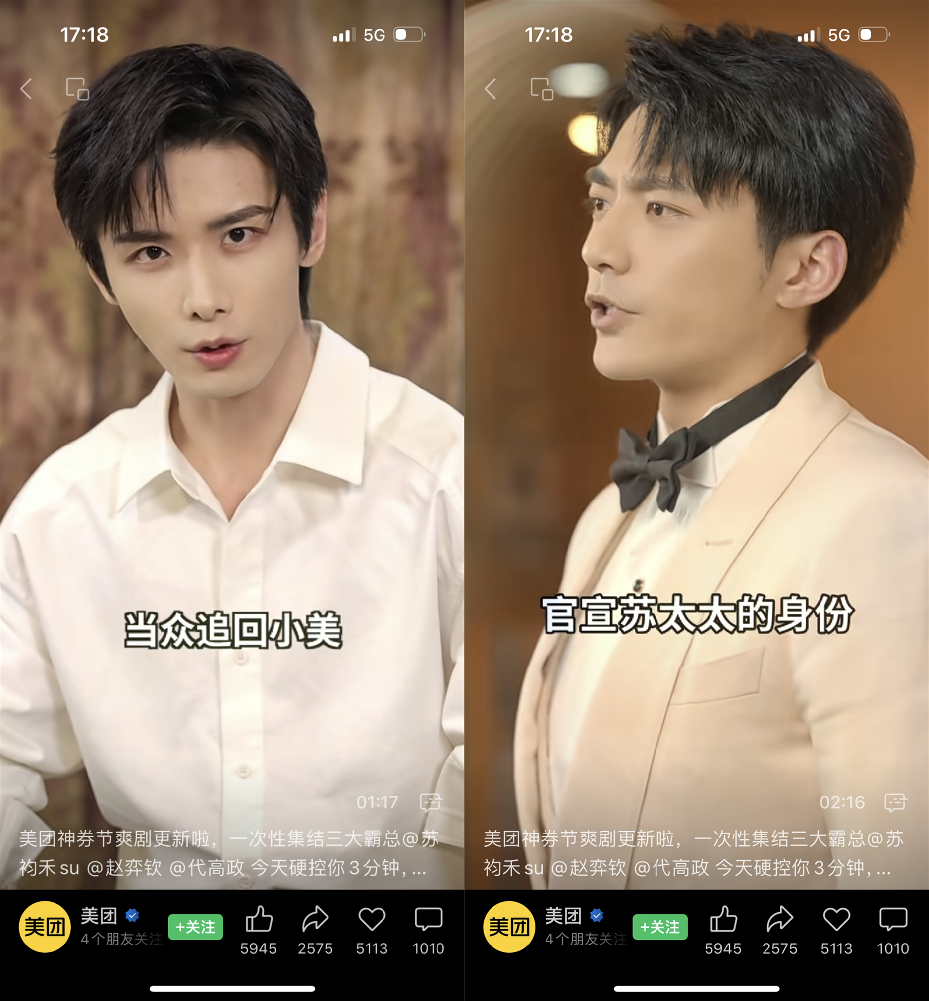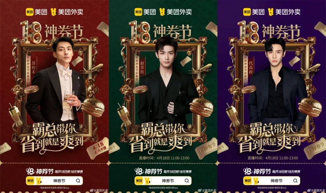 事實上,這是今年4月18日**美團神券節傳播策劃的一部分。**三大“頂流霸總”蘇袀禾、代高政、趙弈欽集結,身着黑西裝出演“追妻反轉”短劇,霸總們首次合體直播,配合神券帝國風海報、線下霸總主題店等,“霸總爽劇氛圍”拉滿。