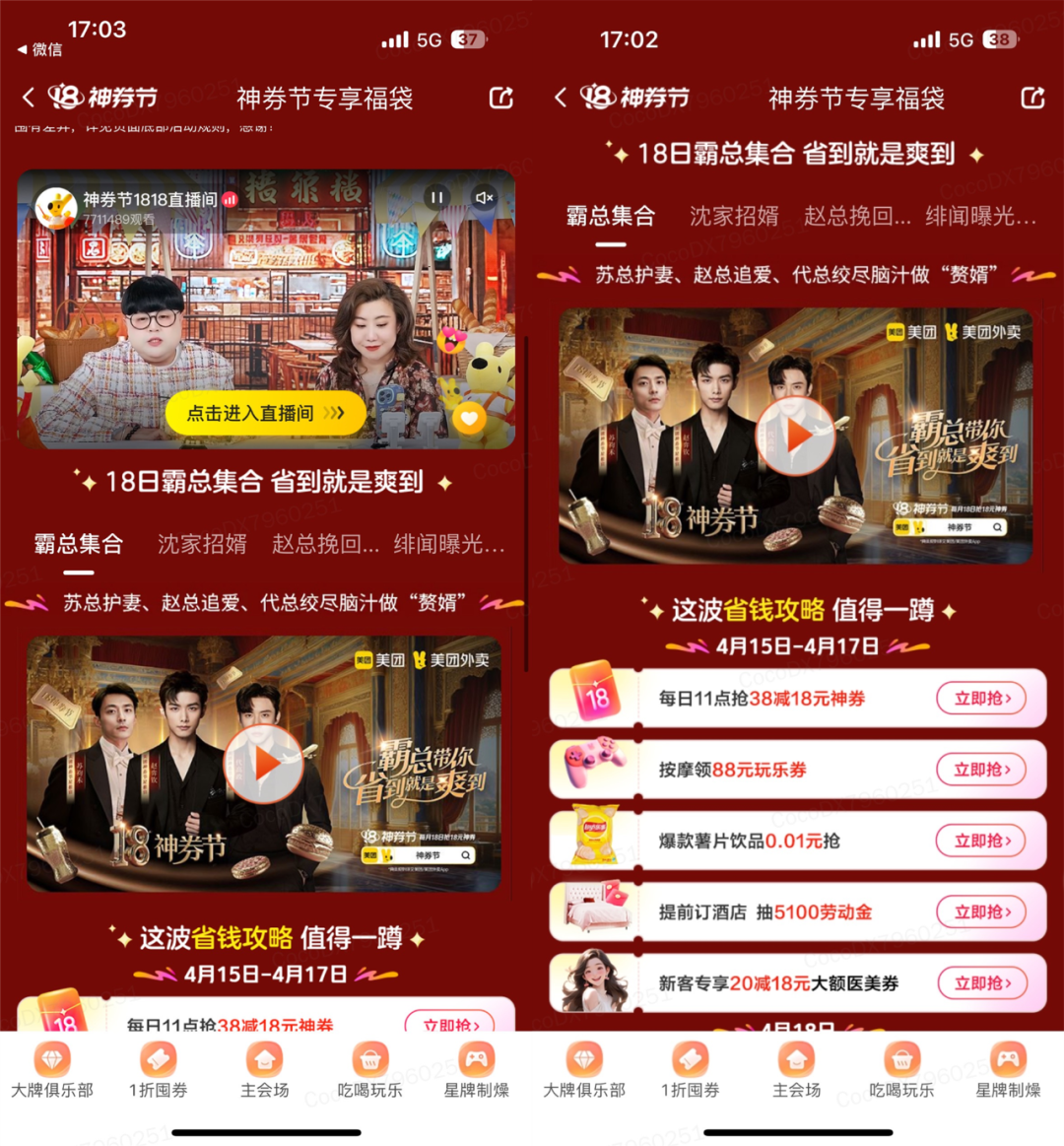 在此基礎上的玩法創新,進一步錦上添花。平台挖掘到神券節和霸總營銷、短劇營銷的深度契合點,借勢熱門短劇但並不直接定製短劇,以富有網感的玩法提升全網曝光度關注度,以優惠留住用户。