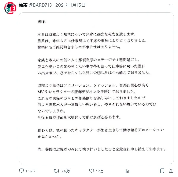 當時已有數個月未更新的焦茶的推特賬號,突然發佈了一條訃告。