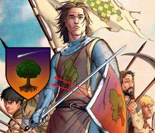 紋章圖案上有一顆榆樹和一顆劃過天際的綠色流星。