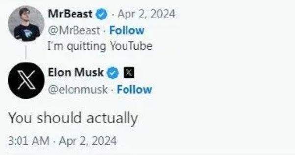 今年愚人節,他開玩笑説要把主陣地從YouTube轉到X平台,馬斯克回覆説:“你確實應該這麼做。”從去年12月開始,馬斯克就一直請野獸先生到X平台發視頻。
