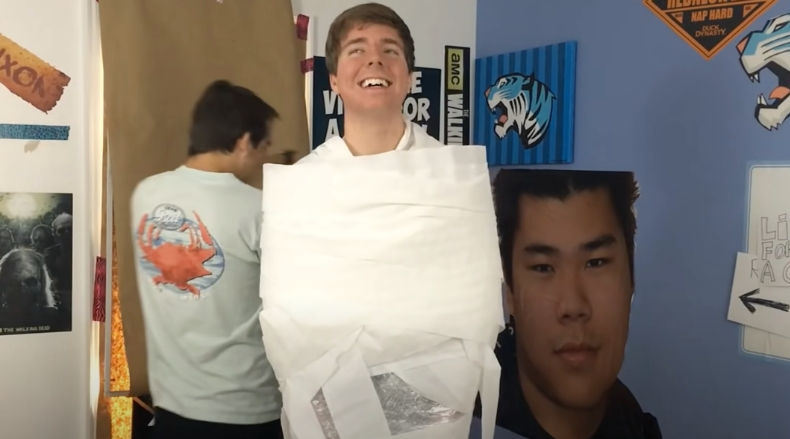 這些視頻,光看標題,觀眾就能感覺到有多麼沙雕。比如《往自己身上纏一百圈保鮮膜+衞生紙》《觀察油漆乾燥一小時》《嘗試在水下停留24小時》《把自己裝進箱子裏郵寄出去》。