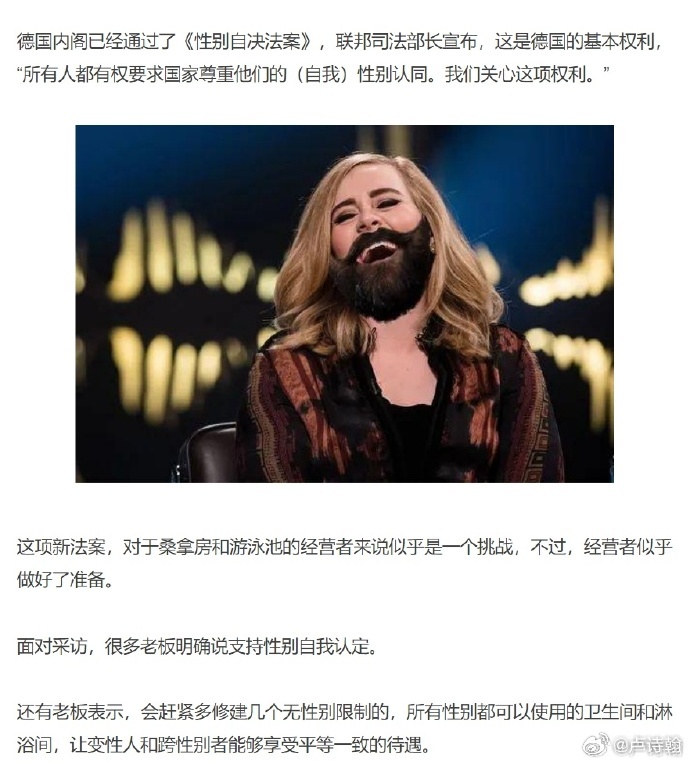 德國的《性別自決法案》最終通過了,現在僅憑自我認知就可以變換性別登記,一年一次申請修改機會。