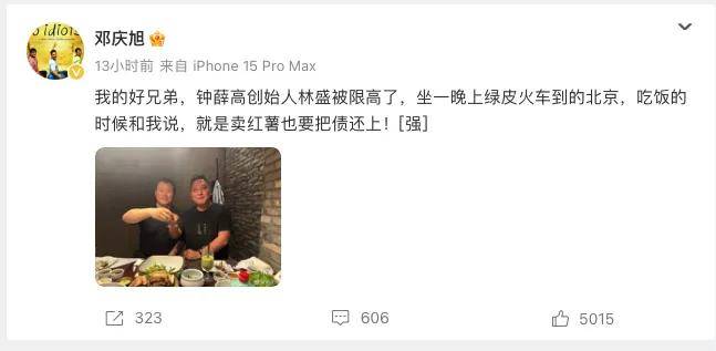 原微博是:「我的好兄弟,鍾薛高創始人林盛被限高了,坐一晚上綠皮火車到的北京,吃飯的時候和我説,就是賣紅薯也要把債還上![強] 」