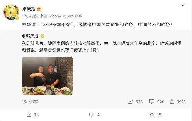 這還不夠,隨後鄧慶旭又接着補充了新的信息,鍾薛高創始人林盛説:「不跑不賴不慫」,併為其點贊,這就是中國民營企業的底色,中國經濟的底色。