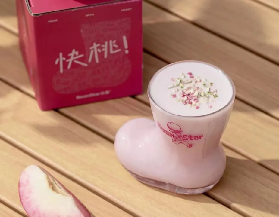 4月12日,比星咖啡上線蜜桃系列新品,採用了限定“逃逃杯”。靴子外形的玻璃杯,裝入粉色的蜜桃飲品,看起來像一個粉色的小雨靴。