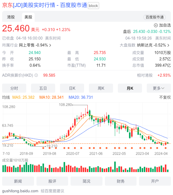 京東成長性減弱,這很難不讓資本市場感到擔憂。目前,京東美股股價僅為25.46美元/股,相較2021年初108美元/股左右的高點,下跌約76.43%。