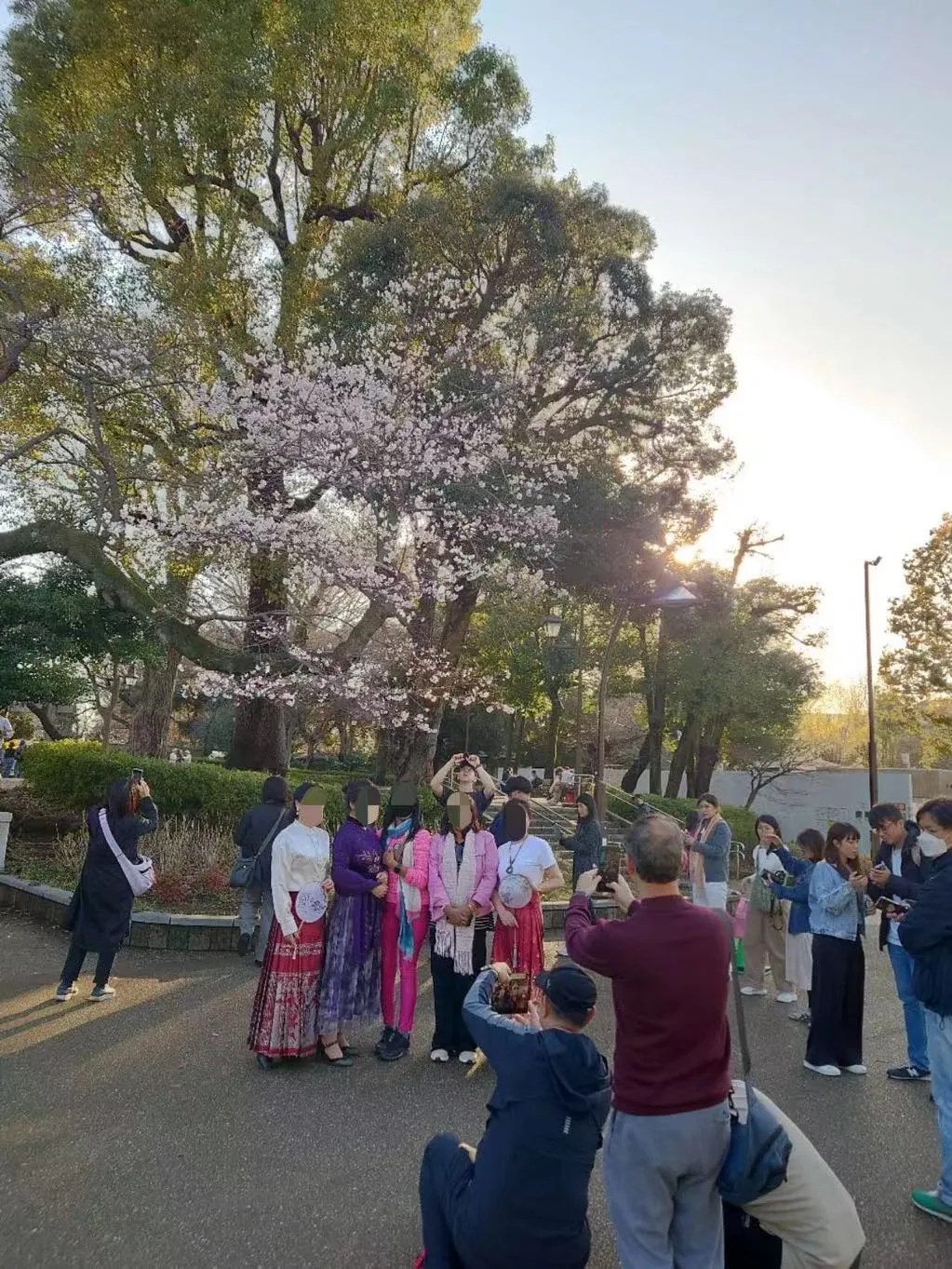 我相當震驚,即使往年櫻花盛開了,外國遊客也不像今年那麼多。一羣精心打扮的中國阿姨們在僅有半開的一株樹下合照,馬上也被歐美遊客圍住“真美啊!”求合照。