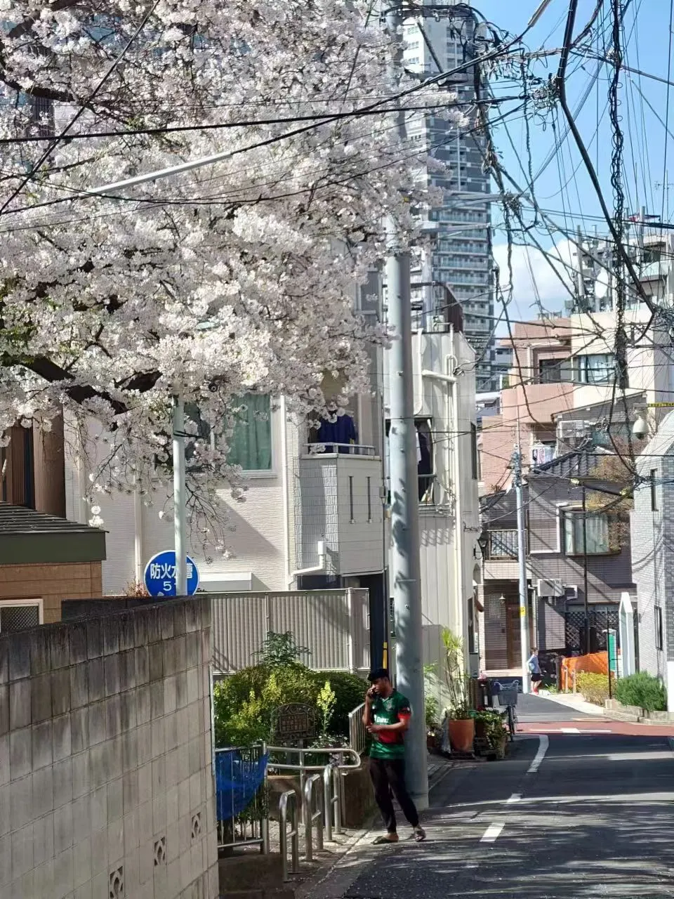 這天晴朗明媚,適合散步,離開靈園後穿過幾條巷子,街邊轉角總有那麼幾株吸引人,獨自美麗的櫻花。一位南亞人穿着隨意,腳踏託鞋,在盛開的櫻花樹下講電話。應該是在附近打工的吧!他又打開視頻,繞着櫻花樹一圈,一看就知道讓遠方親友也見見櫻花。