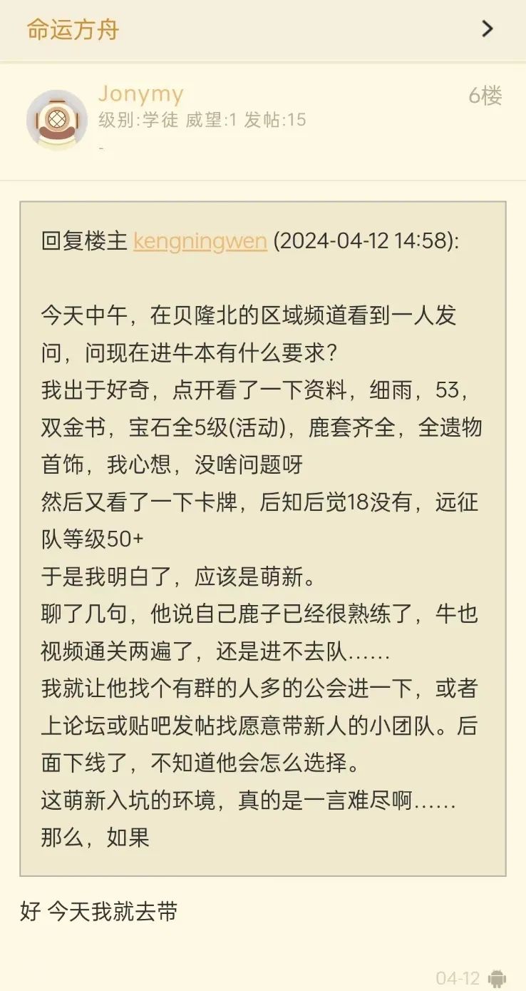 這樣的玩家現在遊戲裏當然也仍有不少,但所幸的是,更多有着“大俠風範”的玩家也正在湧現,會自發帶新手玩家挑戰高難度本,即便這事兒不會給他們帶來什麼直接的好處。