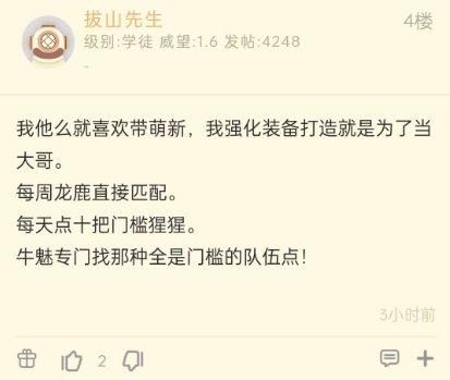 但運營終究無法手把手地去照顧每一個新手,這是隻有靠玩家間自發的社交氛圍才能解決的事。