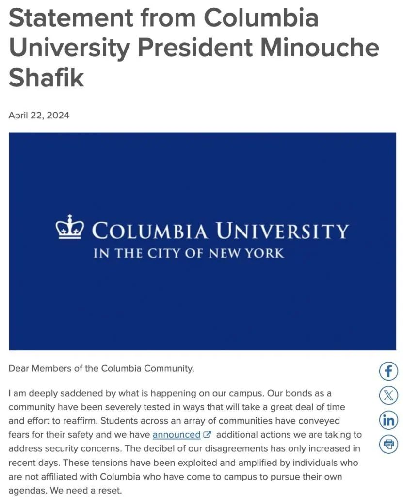 哥大校長米努什·沙菲克(Minouche Shafik)在一份聲明中説:“我對我們校園發生的事情深感悲痛。我們作為一個社區的紐帶受到了嚴峻的考驗,需要花費大量的時間和精力來重建。”