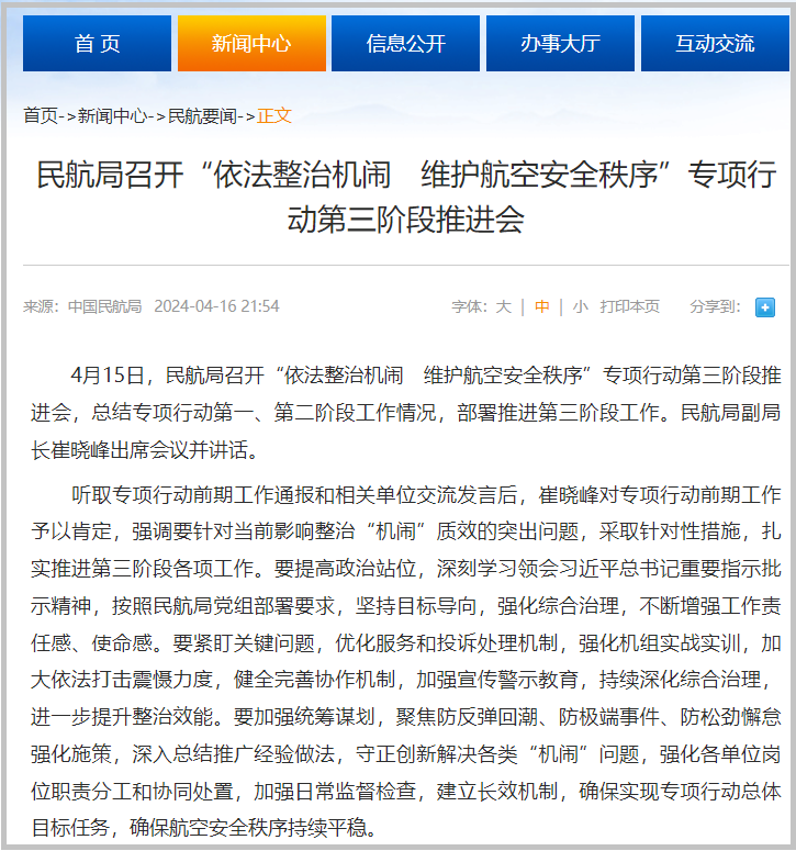 就在這件事發生的前一天,4月15日,民航局召開**“依法整治機鬧 維護航空安全秩序”專項行動第三階段推進會**,總結專項行動第一、第二階段工作情況,部署推進第三階段工作