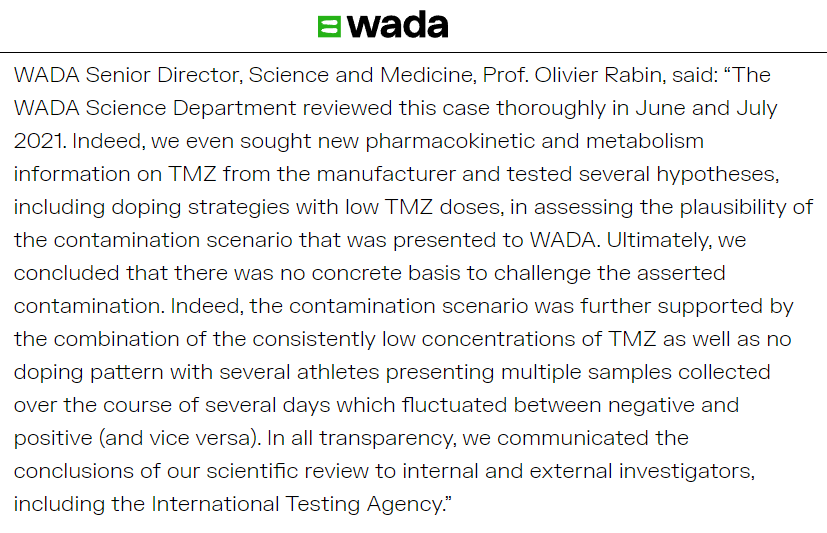 4月20日,WADA的科學和醫學部高級主任奧利維爾·拉賓在反駁美媒報道時表示,WADA早在2021年6月和7月就徹查了案件。他們還從曲美他嗪的製造商那裏,獲取了新的藥物代謝動力學和代謝信息,並進行了比對測試。相關的調查都是透明的,結果也報告給了2018年成立的一個獨立興奮劑檢測機構,位於瑞士的國際檢測機構ITA。