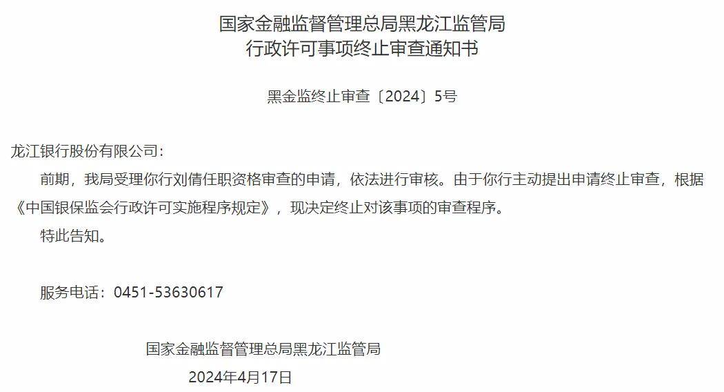 黑金監終止審查〔2024〕5號通知書則顯示,前期,黑龍江監管局受理龍江銀行劉倩任職資格審查的申請,依法進行審核。由於龍江銀行主動提出申請終止審查,同樣,決定終止對該事項的審查程序。