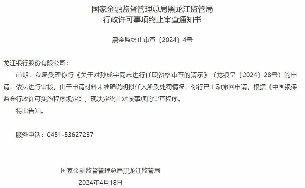 黑金監終止審查〔2024〕4號通知書顯示,黑龍江監管局此前受理了龍江銀行《關於對孫成宇同志進行任職資格審查的請示》(龍銀呈〔2024〕28號)的申請,依法進行審核。因為申請材料未準確説明擬任人所受處罰情況,龍江銀行已主動撤回申請,根據《中國銀保監會行政許可實施程序規定》,決定終止對該事項的審查程序。