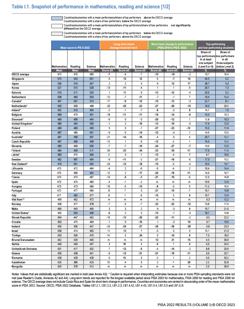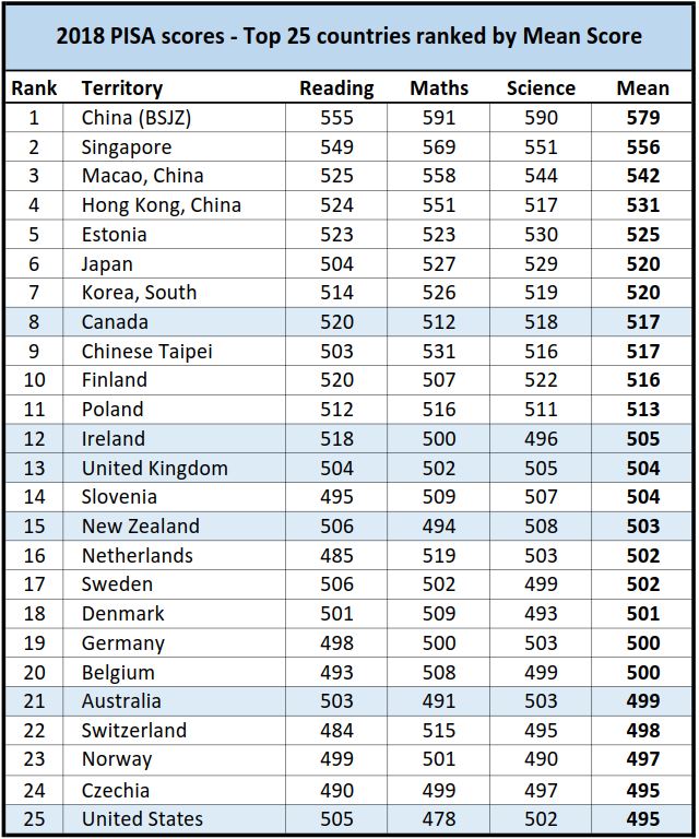 同一年,上海代表中國也首次參與PISA,位列第一。之後除2015年廣東參與的那屆排名第十外,中國都位列第一(由於疫情原因中國大陸學生未參與2022年舉辦的最近一屆PISA測評)。