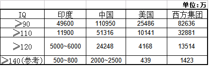 印度IQ≥90的人口總數約5億,不到中國的一半;IQ≥110的人口約1.2億,不到中國的1/4;IQ≥120的“工程師紅利”人口則為5000~6000萬,約為中國的1/4;IQ≥140的人口更只有500~800萬,也為中國的1/4。