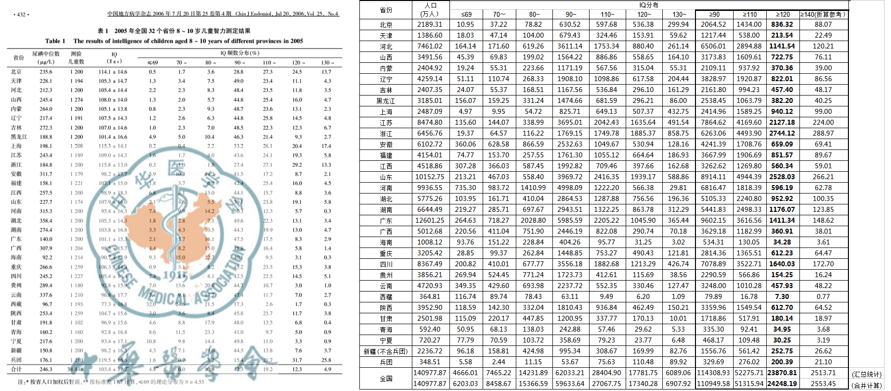 根據前幾年公佈的建國以來唯一一份全國性兒童智力調查,以及2020年全國人口統計數據,粗疏地(不考慮“弗林效應”,未限定樣本的可代表性、發展性及擴展性等)大致推算了中國的全樣本IQ人力資源分佈:
