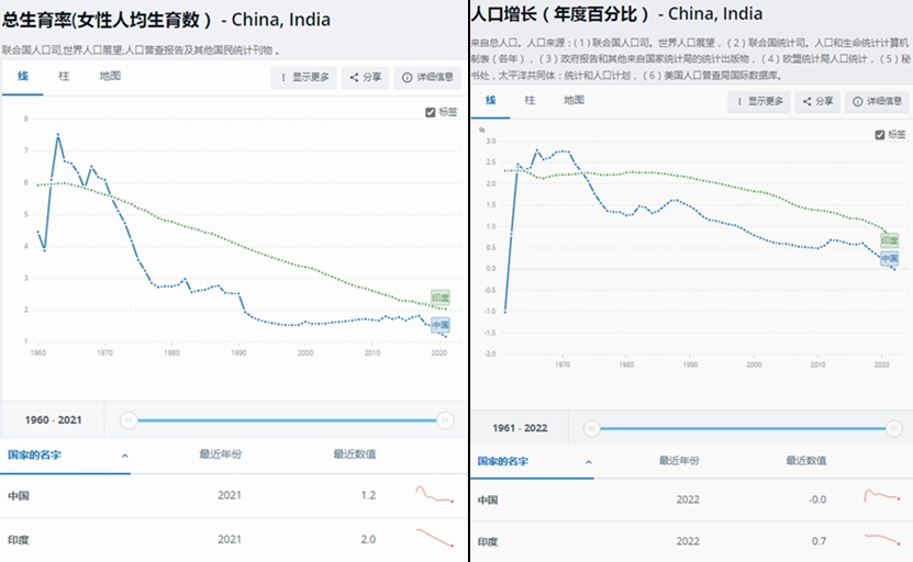 而目前中印兩國15~64歲之間的適齡勞動力人口比例相差不大(中國略高)。不過由於中國生育率快速下降導致的“老齡少子化”問題更加突出,人口增長速度也更低,會對未來的有效勞動力供給帶來一定影響。