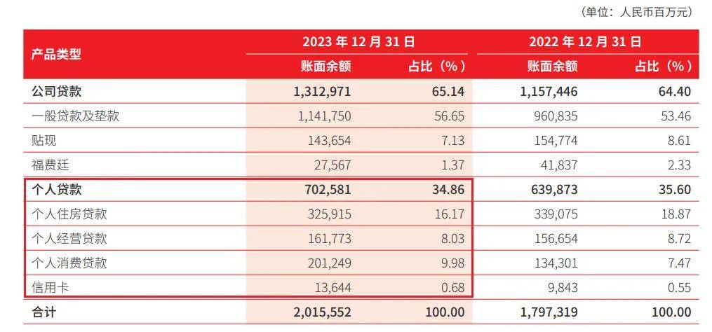 截至2023年末,個人住房貸款為3259.15億元,較上年末減少131.6億元,降幅為3.88%;個人經營貸款1617.73億元,較上年末增加51.19億元,增幅為3.27%;個人消費貸款2012.49億元,較上年末大增669.48億元,增幅為49.85%;信用卡貸款136.44億元,同比增長38.62%。