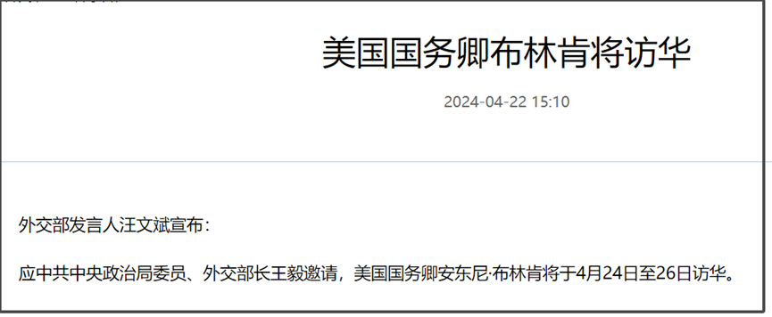關於布林肯訪華的事情,我們今天也官宣了,布林肯是4月24日-26日訪華。