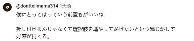 他説話前都會加上"對我來説"這樣的前置詞,我覺得很好。給人的感覺不是要強加自己的價值觀給別人,而是希望能為你提供更多選擇,這種態度讓人很有好感。