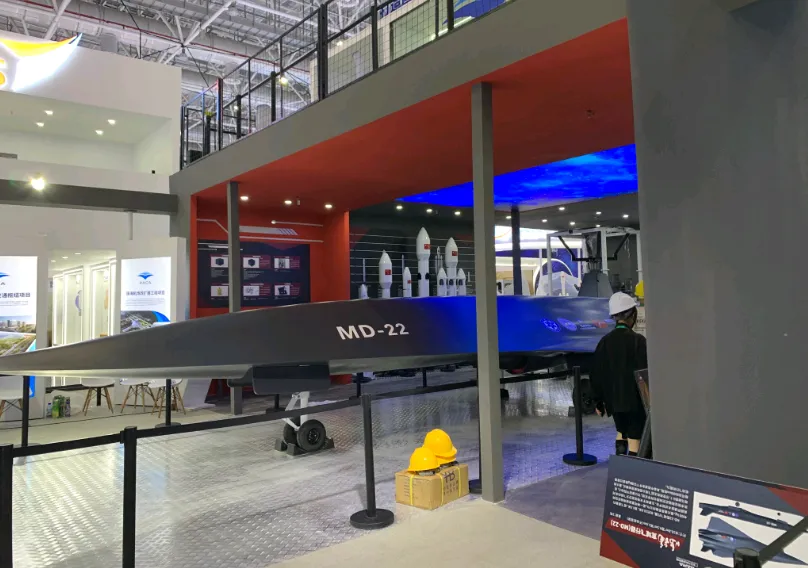 還有人猜測轟-6可能攜帶的是MD-22“鳴鏑”高超音速飛行器。在2022年的珠海航展上,曾展出過這種高超音速飛行器的模型。它全長10.8米,翼展4.5米,重約1噸。最大起飛重量4噸,最大飛行速度可達7馬赫,續航里程8000公里。報道提到,尚不清楚MD-22是否能從現有機型上發射,但可以借鑑美國的做法——例如美國平流層發射公司就是利用大型“平流層發射”運載飛機從空中發射Talon-A高超音速飛行器,因此也不排除MD-22的衍生型號是利用轟-6作為運載平台進行試飛。報道稱,MD-22模型的總體形狀和配置,與出現在這張照片中飛行器有一些相似之處。