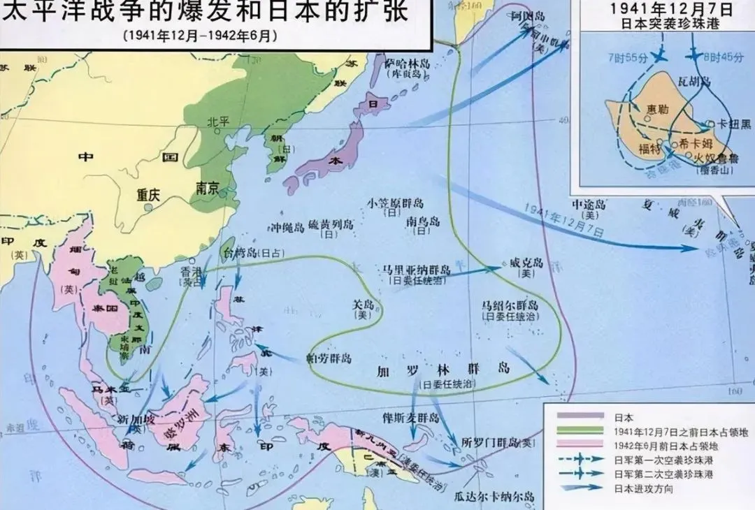 二戰爆發後,美日談判破裂。1941年,日本海軍偷襲珍珠港,日本陸軍則南下東南亞,搶奪英法美等國的殖民地。