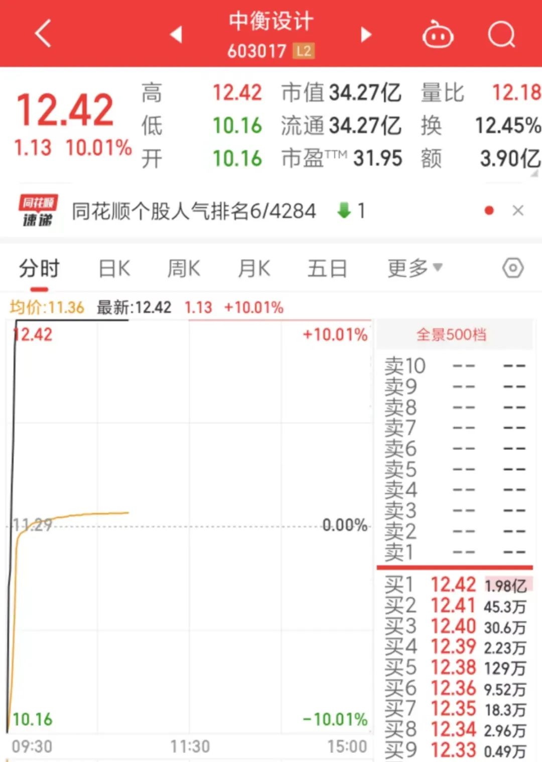 今日早盤,五連板大牛股中衡設計(603017)以跌停價開盤,但開盤後迅速拉昇,9:35已拉至漲停。這是該股連續第六個交易日漲停。