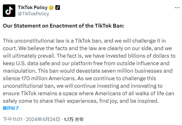 這項違憲的法律是TikTok禁令,我們將在法庭上挑戰它。我們相信事實和法律顯然站在我們這一邊,我們最終會獲勝。事實上,我們已經投入了數十億美元來保護美國數據安全,保護我們的平台免受外界影響和操縱。這項禁令將摧毀700萬家企業,讓 1.7億美國人噤聲。在我們繼續挑戰這項違憲禁令的同時,我們將繼續投資和創新,確保TikTok仍然是各行各業的美國人可以安全地分享他們的經歷、尋找快樂和受到啓發的空間。