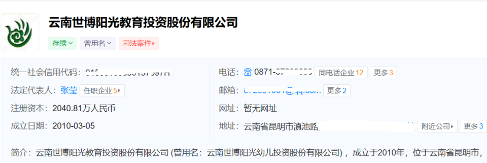 天眼查顯示,雲南世博公司(曾用名:雲南世博陽光幼兒投資股份有限公司、昆明陽光幼兒投資有限公司)成立於2010年3月5日,註冊資本2040.81萬元,法定代表人是張瑩,其是董事長兼總經理。